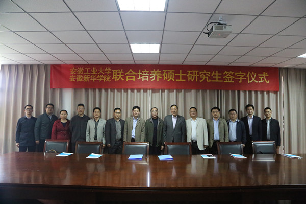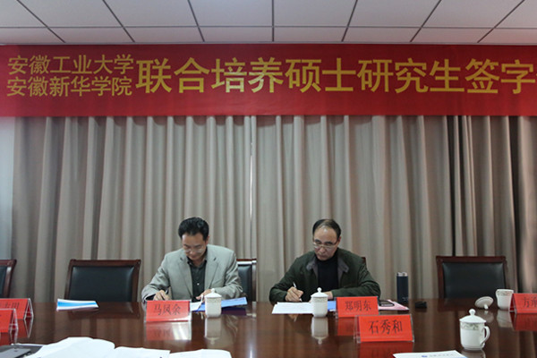 4月27日,,,,,,,,安徽新葡萄娱乐场798学院与安徽工业大学团结作育硕士研究生签字仪式在行政楼第三聚会室举行。。。。。。。安徽省教育厅科研处副处长江贵生,,,,,,,,安徽工业大学研究生院常务副院长郑明东,,,,,,,,新葡萄娱乐场798集团副总裁、校执行董事陆真,,,,,,,,校长石秀和,,,,,,,,副校长杨世国、马凤余等相关向导出席签字仪式,,,,,,,,安徽新葡萄娱乐场798学院相关职能部分和二级学院认真人加入了签字仪式。。。。。。。签字仪式由陆真主持。。。。。。。