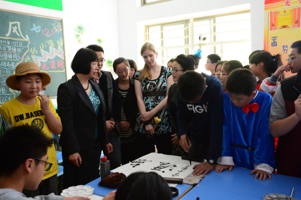 随后,,,,,,,,Emily校长寓目了学生书法、国画、勾勒脸谱的现场演示,,,,,,,,关于中国古板文化体现出浓重的兴趣。。。。。。同砚们把各自作品送给Emily校长作为纪念,,,,,,,,Emily愉快地接受,,,,,,,,并与同砚们开心地与同砚们合影。。。。。。